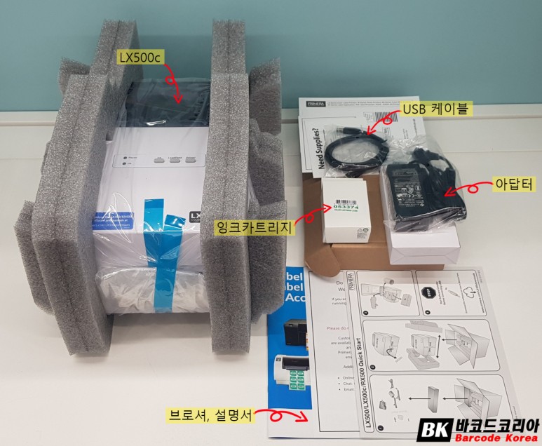 박스 안에는 LX500c, 브로셔, 설명서, 악세사리박스에는 USB 케이블, 아답터, 잉크카트리지가 들어 있습니다.