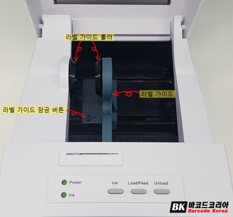 라벨 장착 부분에는 라벨가이드 롤러, 이동식 라벨 가이드, 외부 라벨 투입구로 팬 폴드(접지)라벨 사용시 라벨가이드를 고정하기 위한 라벨 가이드 잠금 버튼이 있습니다.